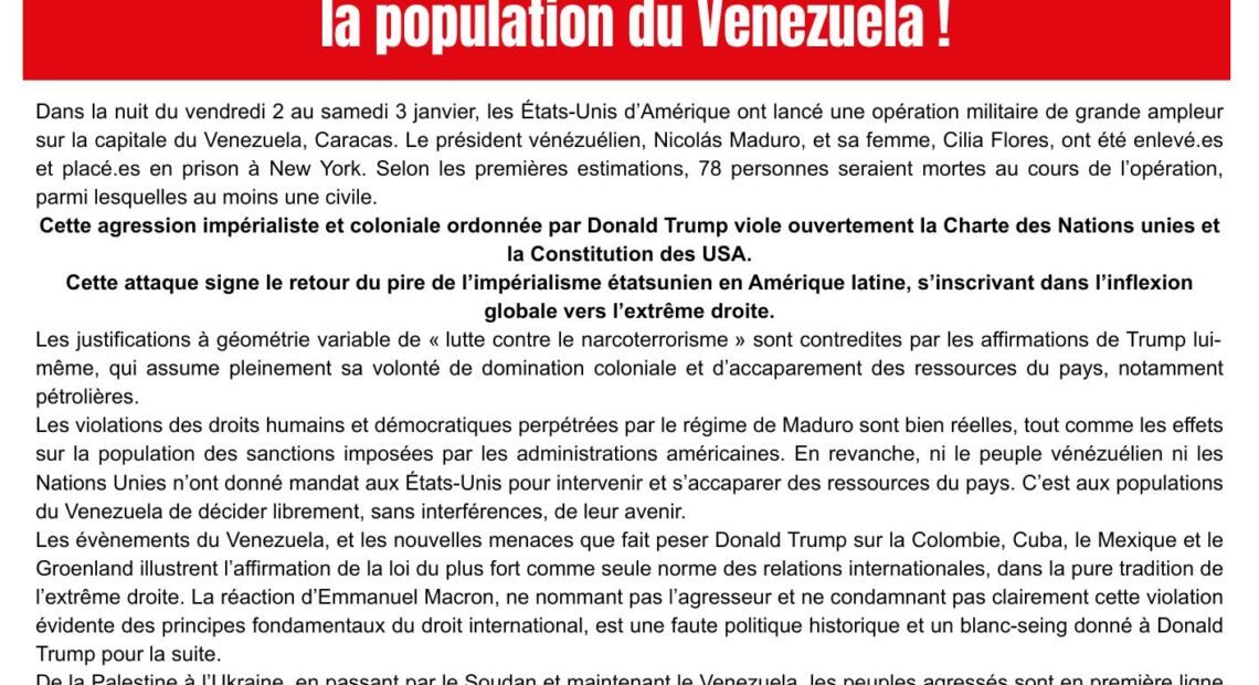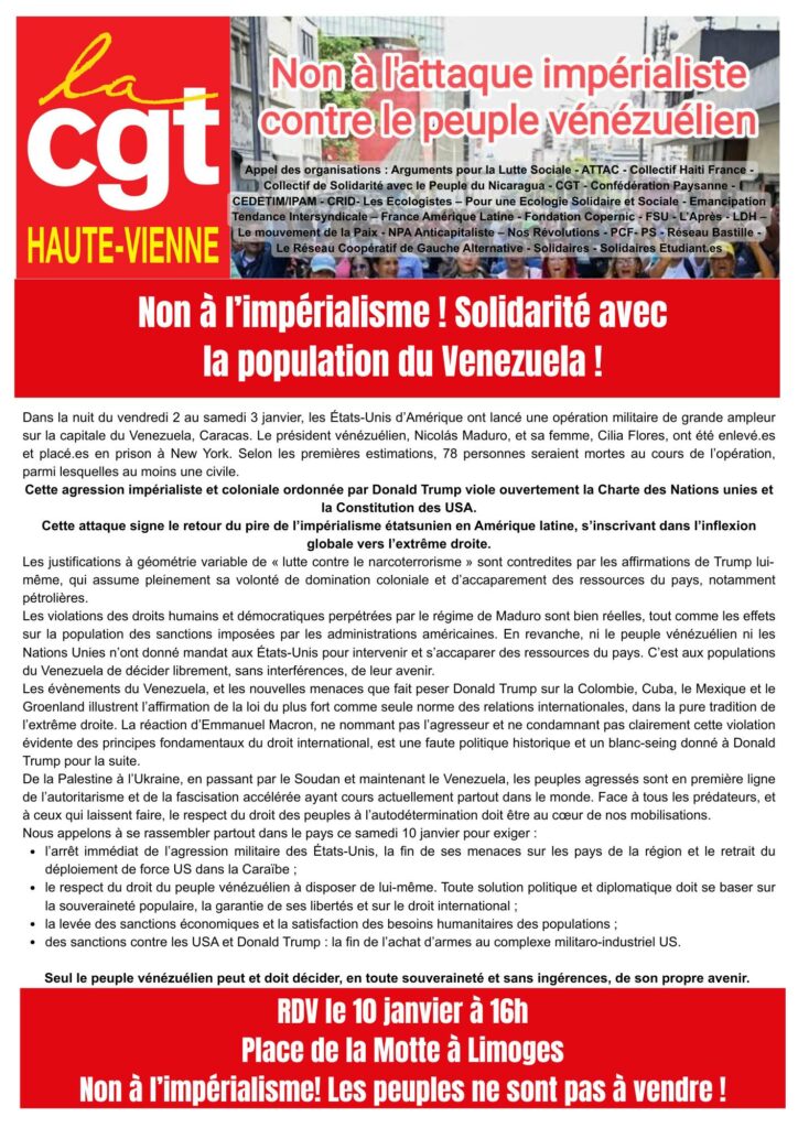 Haute-Vienne 10 janvier : Non à l’attaque impérialistre contre le peuple vénézuélien Mobilisation contre l’impérialisme et soutien au peuple Vénézuélien, samedi 10 janvier à 16h, place de la Motte Partager: Navigation de l’article Précédent Article précédent 8 janvier : Stop à l’agression impérialiste contre le VénézuélaSuivant Article suivant : Communiqué : 10 ans, mais le droit des salarié.e.s rétabli Autres actualités 16 février : Pour la retraite à 60 ans, mobilisons-nous 27 janvier : Salariés du public et du privés, jeunes, retraités, privés d’emploi, en grève et manifestation Vidéo de la conférence – Anatomie de l’affiche rouge