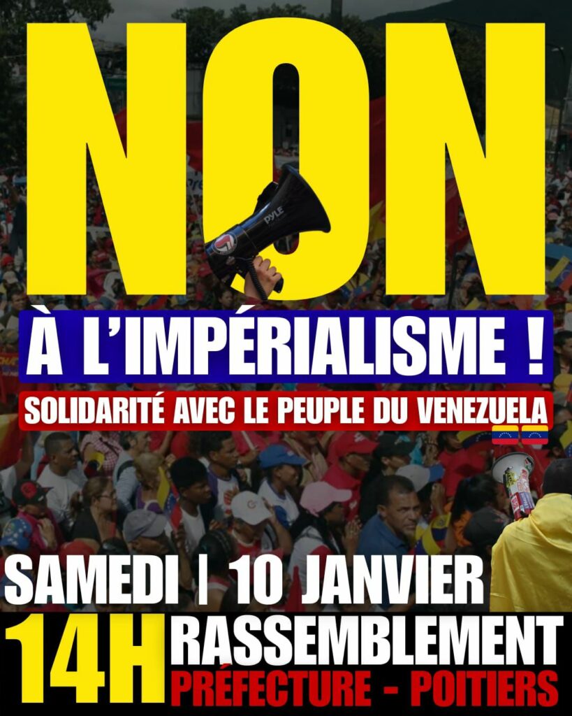 Vienne 10 janvier : Non à l’impérialisme, Solidarité avec le peuple du Vénézuéla Partager: Navigation de l’article Précédent Article précédent Le comité régional CGT NA vous présente ses voeux pour cette nouvelle année 2026Suivant Article suivant : 6 janvier : Stop à l’agression impérialiste contre le Vénézuéla Autres actualités 16 février : Manifestation contre la réforme des retraites 20 mars : Reprenons en main nos retraites Communiqué de presse des OS : Répression syndicale : Appel à la mobilisation et dénonciation des atteintes aux libertés