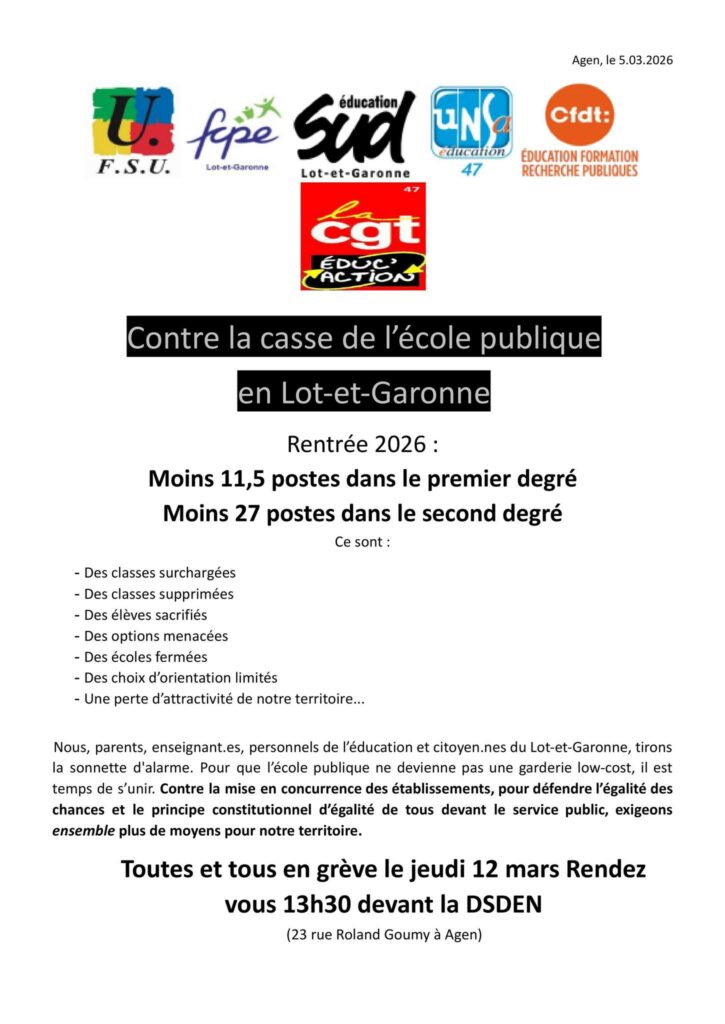 JEUDI 12 MARS : Grève et mobilisation des lycées et collèges touchés par l’austérité budgétaire. Attention, après les municipales, les fermetures ou les regroupements des écoles risquent d’être nombreux et toucherons aussi les personnels des mairies !