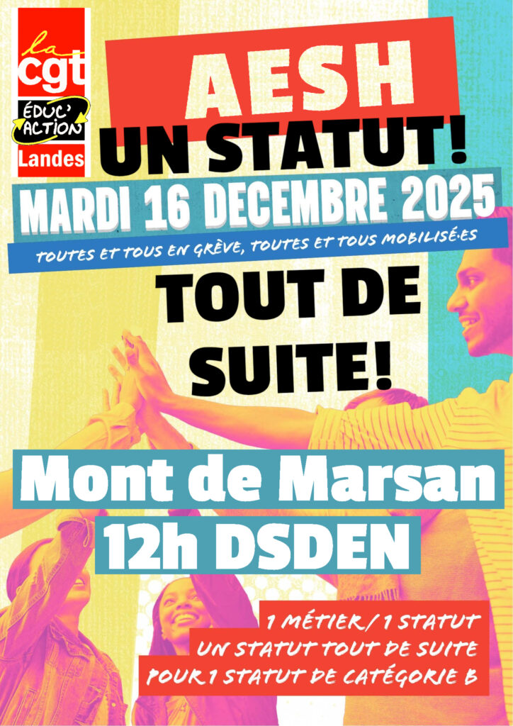 MARDI 16 DECEMBRE, AESH UN STATUT ! Rassemblement 12h Mont de Marsan DSDEN. Journée nationale de grève dans l’EN