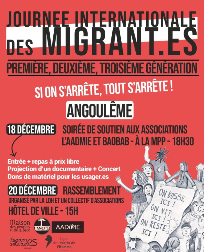 Charente 18 décembre : Journée internationale des migrant.e.s ATTENTION CHANGEMENT DE L’HORAIRE =RASSEMBLEMENT LE 20 DECEMBRE A 11H AU LIEU DE 15H Partager: Navigation de l’article Précédent Article précédent 17 décembre : Les salariés de Lecas devant le commissariat de police d’AngoulêmeSuivant Article suivant : 3 décembre : Ste Soline – Rassemblement de soutien – Procès en appel Autres actualités 8 mars: Grève féministe 1er mai : Paix, Liberté, Solidarité ! 5 décembre: Journée de mobilisation pour le service public
