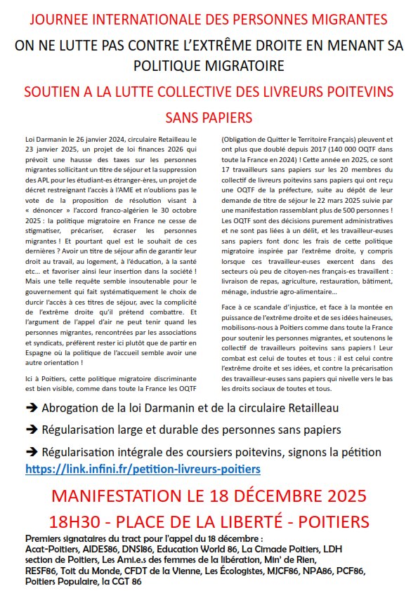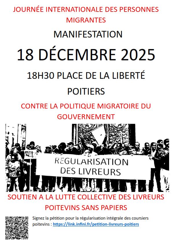 Vienne 18 décembre : Manifestation – Journée internationale des personnes migrantes Partager: Navigation de l’article Précédent Article précédent Motion de Soutien de l’UD 87 à Sophie BinetSuivant Article suivant : On ne fera pas taire la CGT et sa secrétaire générale ! Autres actualités 24-25 mars : Toutes et tous en grève ! 20 mars : Reprenons en main nos retraites 30 novembre: Rassemblement Palestine