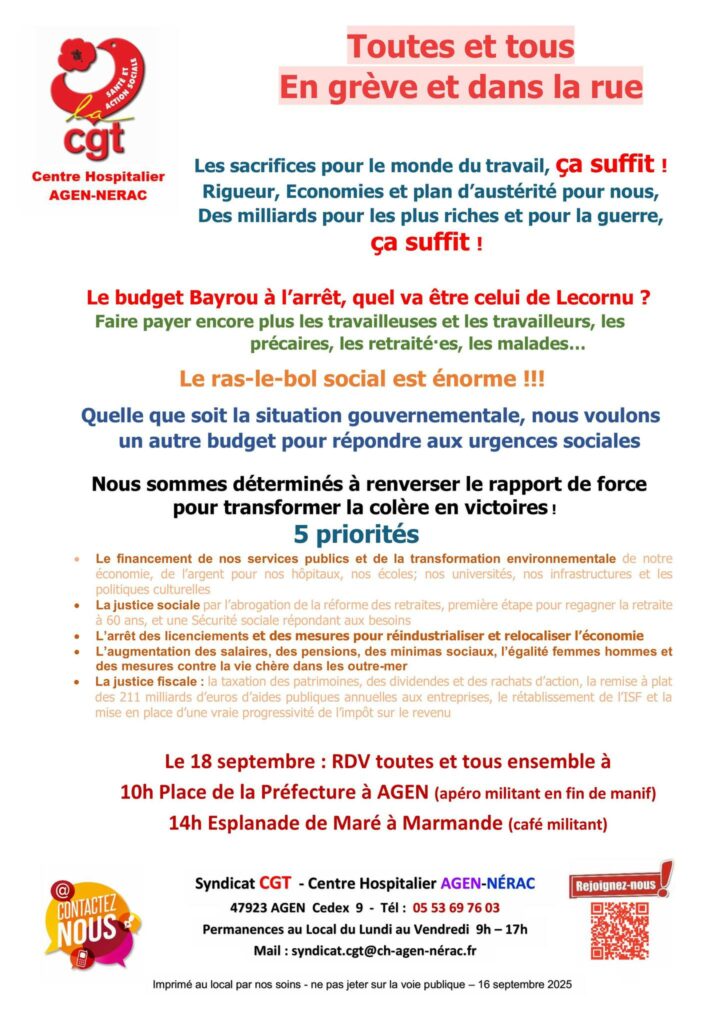 Lot-et-Garonne 18 septembre : Les sacrifices pour le monde du travail, ça suffit ! Partager: Navigation de l’article Précédent Article précédent 18 septembre : Les sacrifices pour le monde du travail, ça suffit !Suivant Article suivant : 18 septembre : Les sacrifices pour le monde du travail, ça suffit ! Autres actualités 3ème jour de grève des postier.e.s de Damazan 8 mars : Grève et manifestation à Agen 14H30 Le tour de France avec la CGT du Lot et Garonne