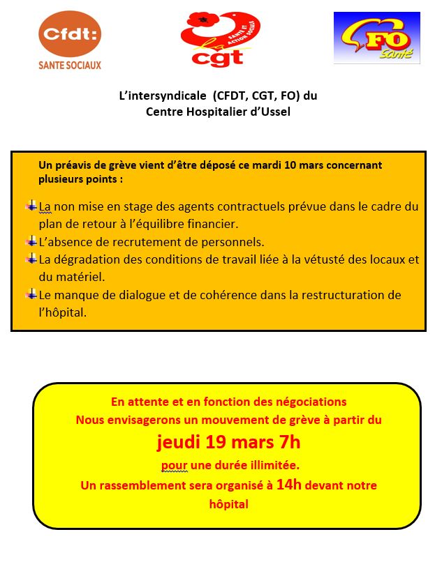 Corrèze 19 mars : Grève au Centre Hospitalier d’Ussel Partager: Navigation de l’article Précédent Article précédent 12 mars : Grève et mobilisation des lycées et collègesSuivant Article suivant : 12 mars : Soutien à Moussa ! Autres actualités 1er mai : Rassemblements Brive, Tulle 1er mai : Unitaire et populaire pour le retrait ! 4 avril : Mobilisation du social et du médico-social