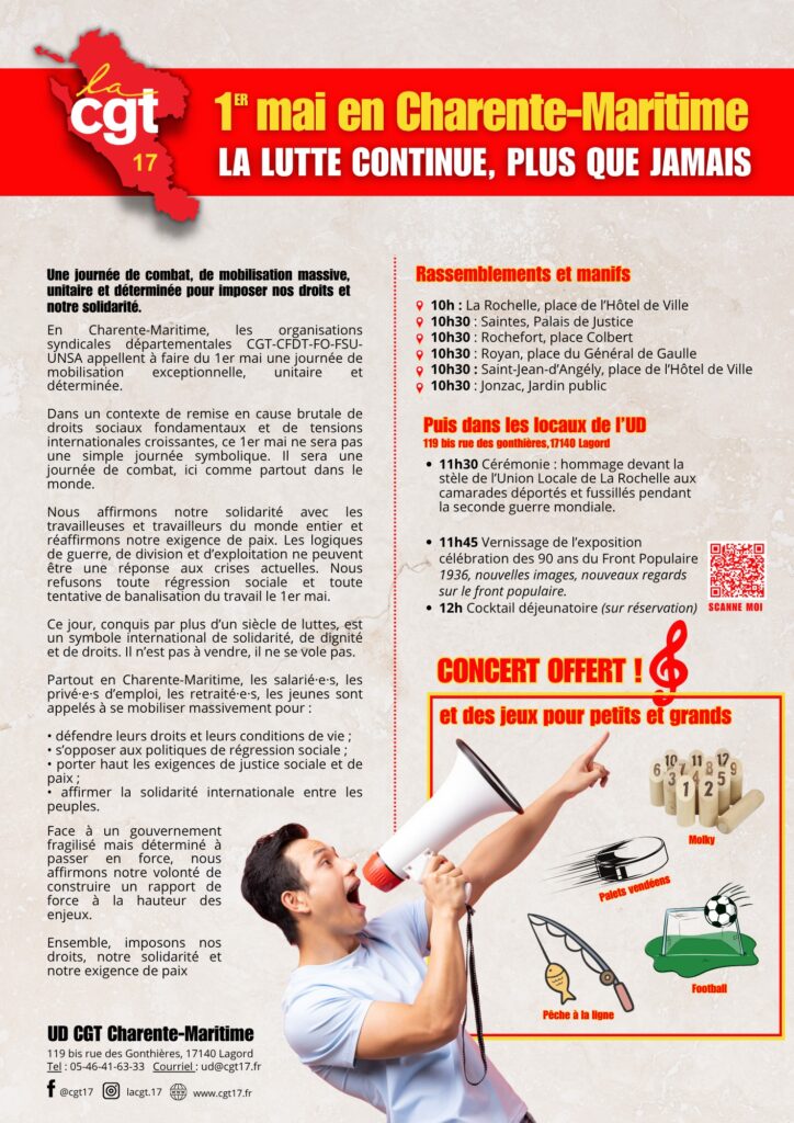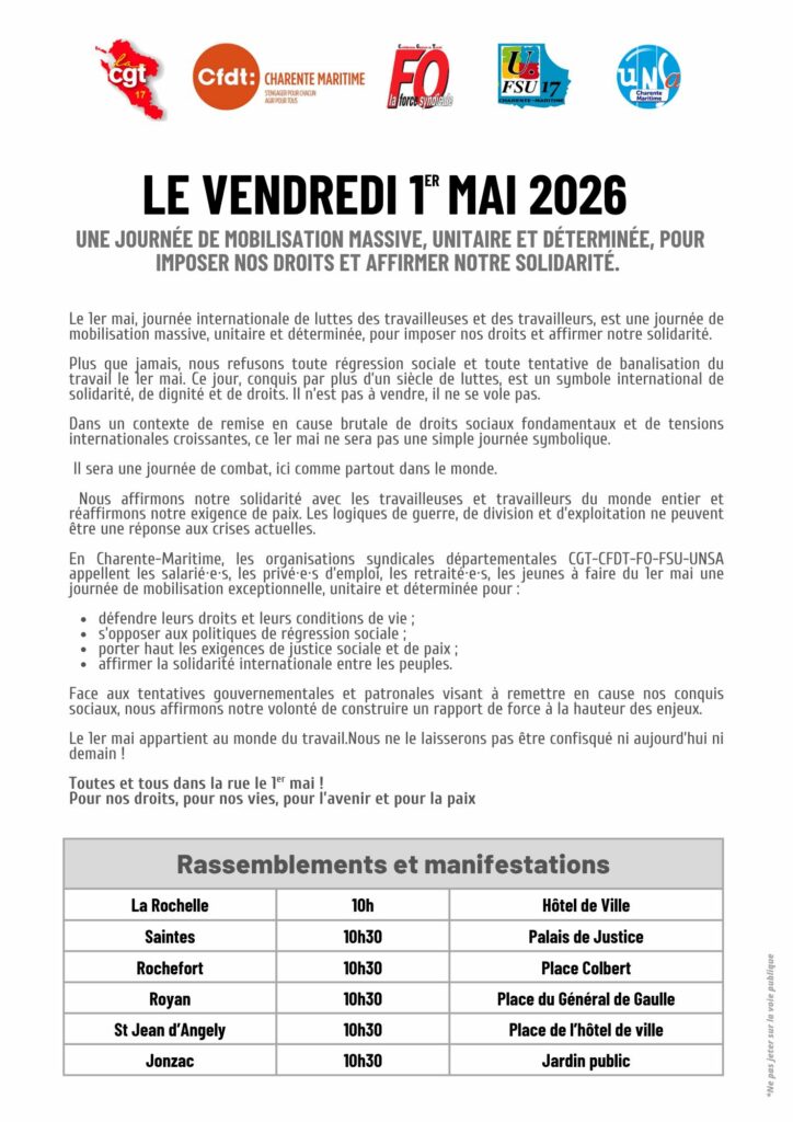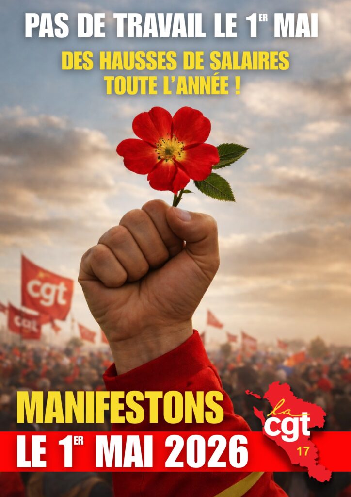 Charente-Maritime 1er mai : Journée Internationale de lutte pour les droits des travailleur·euse·s Partager: Navigation de l’article Précédent Article précédent 1er mai : Journée Internationale de lutte pour les droits des travailleur·euse·sSuivant Article suivant : 1er mai : Journée Internationale de lutte pour les droits des travailleur·euse·s Autres actualités 21 janvier : Rassemblement devant l’hôpital de Rochefort NAO chez FOUNTAINE-PAJOT – APPEL A DEBRAYAGE 3 décembre: Pas d’économie sur le dos des retraité.e.s