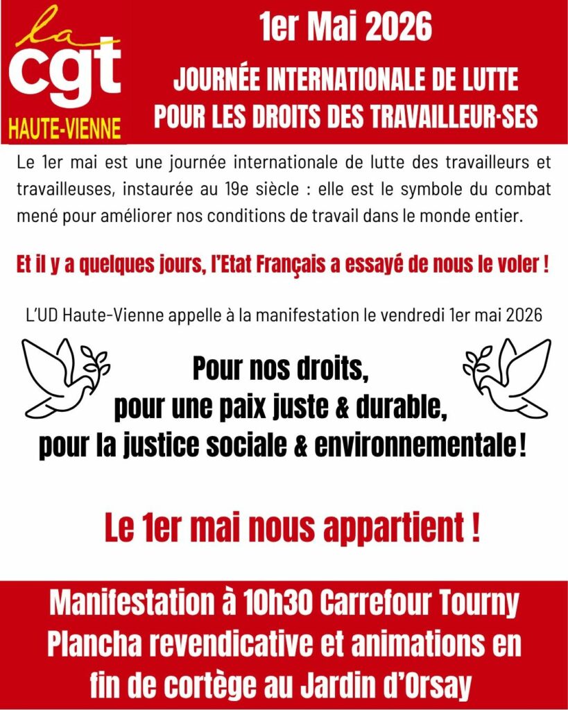 Haute-Vienne 1er mai : Journée Internationale de lutte pour les droits des travailleur·euse·s Partager: Navigation de l’article Précédent Article précédent Ouverture de la 3ème conférence régionale CGT NA en présence de Sophie BinetSuivant Article suivant : 1er mai : Journée Internationale de lutte pour les droits des travailleur·euse·s Autres actualités 21 décembre: Rassemblement contre la loi immigration Lutte gagnante: Le centre courrier de Nieul ne sera pas déporté à Limoge 1er octobre : Mobilisation – Nous avons évité le pire, gagnons le meilleur ! Prenons les choses en main