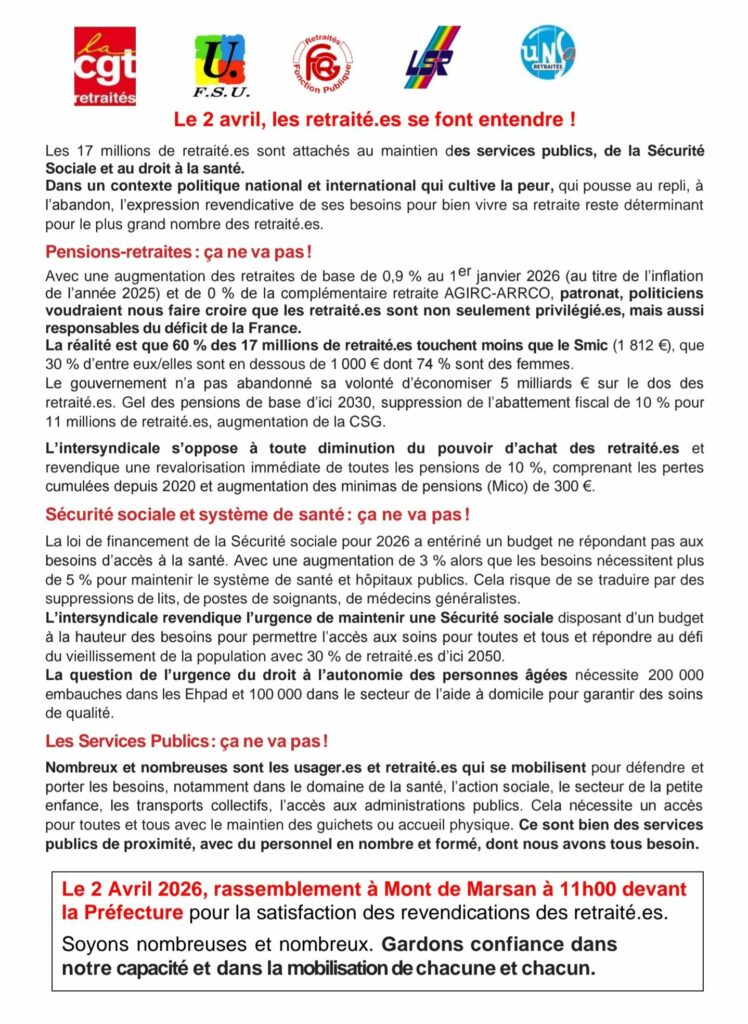 Landes 2 avril : Les retraité.e.s se font entendre ! Partager: Navigation de l’article Précédent Article précédent 31 mars : Mobilisation Educ’Action devant la DesdenSuivant Article suivant : 2 avril : Mobilisation des retraité.e.s Autres actualités 5-7-8 mars : Journée international de lutte pour les droits des femmes 22 juillet : à BISCARROSSE PLAGE de 9h30 à 16h00 TOUS à LA PLAGE, mettons des grains de sable dans les rouages de la politique du gouvernement ! Défense de nos retraites !