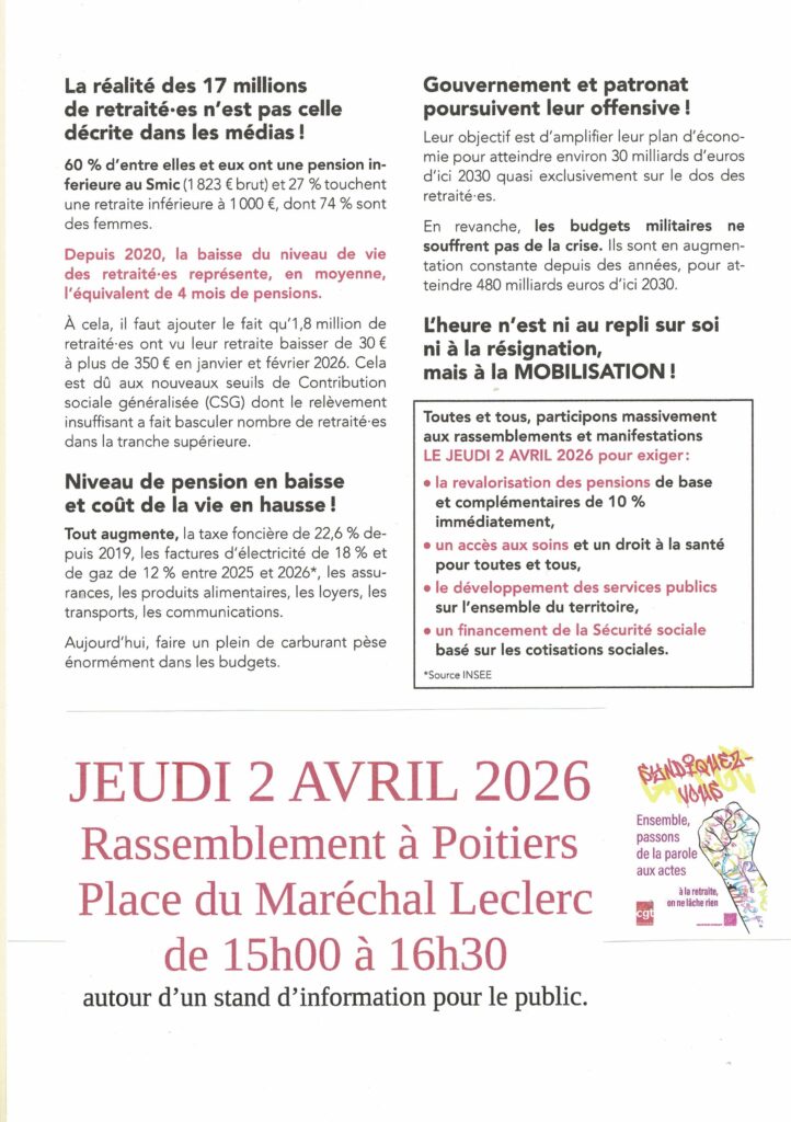 Vienne 2 avril : Mobilisation des retraité.e.s Partager: Navigation de l’article Précédent Article précédent 2 avril : Mobilisation des retraité.e.s Autres actualités 27 juin : Rassemblement et Manifestations 6 avril : Gaza : Arrêtez le massacre ! 20 juin : Rassemblement des syndicats en grève