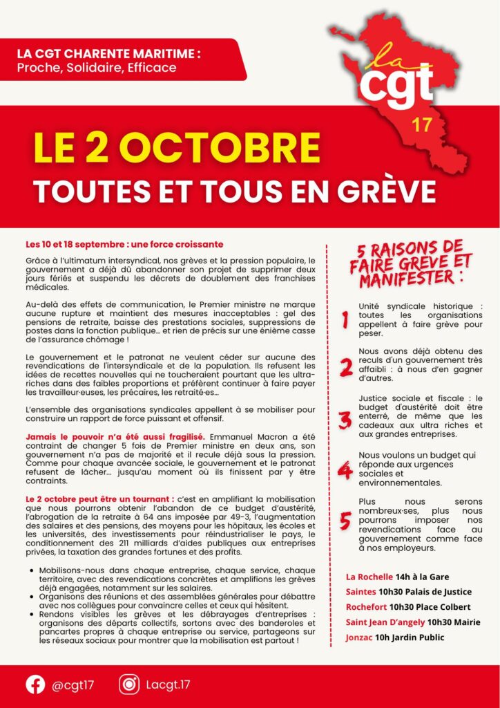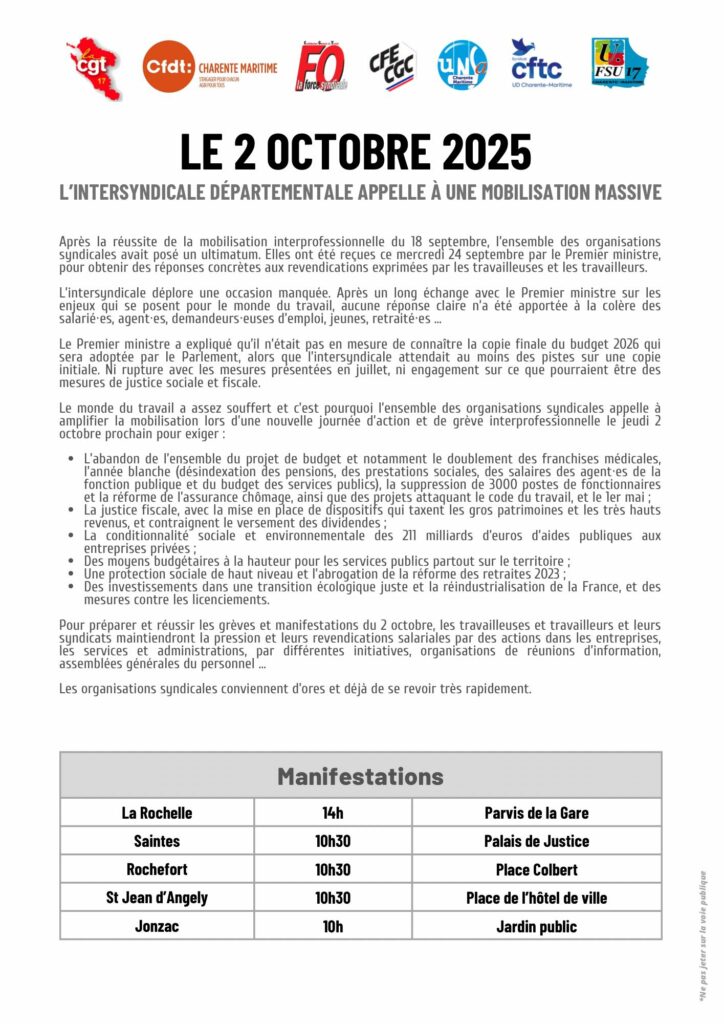 Charente-Maritime 2 octobre : L’intersyndicale départementale appelle à une mobilisation massive Partager: Navigation de l’article Précédent Article précédent 2 octobre : On accélère !Suivant Article suivant : 27 septembre : Manifestation en soutien au peuple palestinien Autres actualités 1er février : Education – Toutes et tous en grève 23 avril : Réforme assurance chômage, exigeons le retrait ! GREVE A L’ENTREPRISE TIPIAK A MARANS