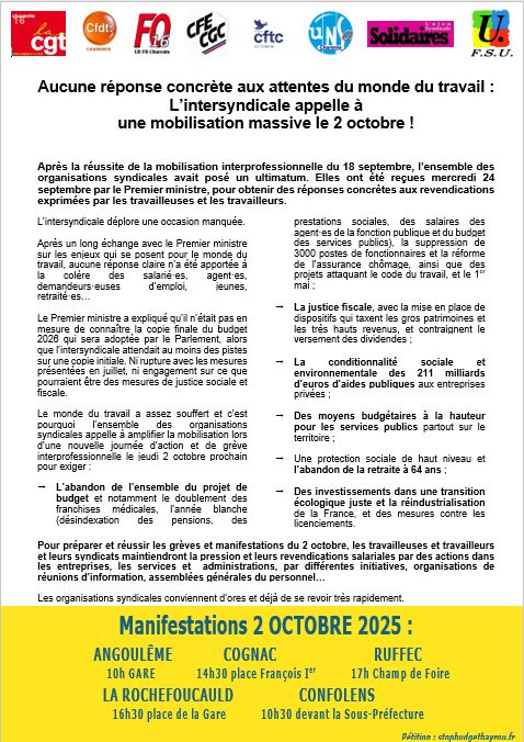 Charente 2 octobre: Manifestation et mobilisation massive! Partager: Navigation de l’article Précédent Article précédent 1er octobre: Rassemblement Stop feminicides !Suivant Article suivant : 2 octobre: On accélère ! Autres actualités 22 mai : Manifestation de soutien au peuple Palestinien Communiqué de presse : Crise à Verallia 13-16 mars: La marche du Rail