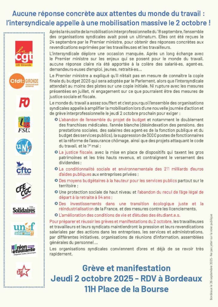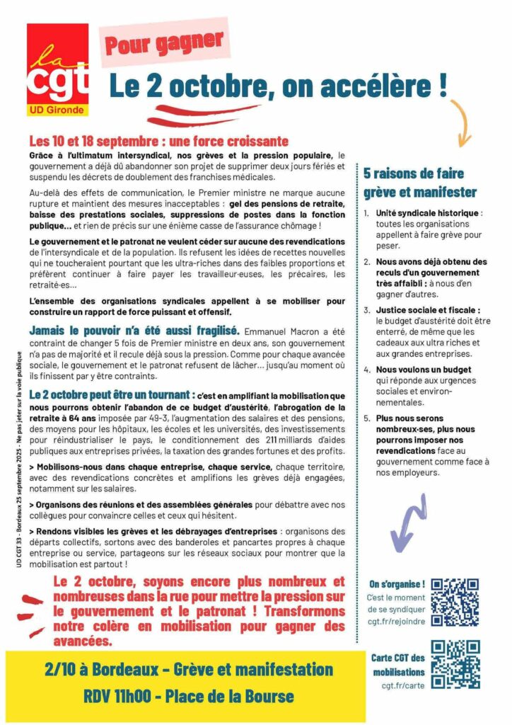 Gironde 2 octobre : On accélère ! Partager: Navigation de l’article Précédent Article précédent 2 octobre: Pour la justice sociale & fiscaleSuivant Article suivant : 2 octobre : L’intersyndicale départementale appelle à une mobilisation massive Autres actualités 17 mars : Manifestation interprofessionnelle et intersyndicale 9 mai : Marche pour le Climat 5 septembre : ATSEM – Appel à rassemblement