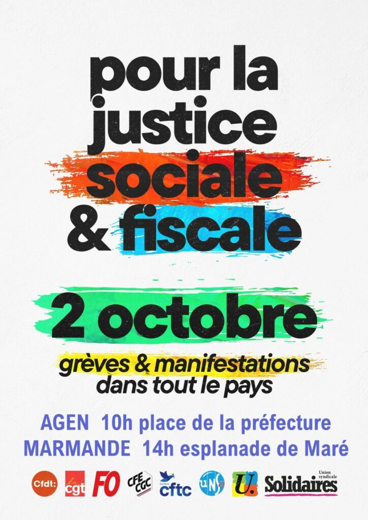 Lot-et-Garonne 2 octobre: Pour la justice sociale & fiscale Partager: Navigation de l’article Précédent Article précédent 2 octobre: Toutes et tous en grève et dans les manifestations !Suivant Article suivant : 2 octobre : On accélère ! Autres actualités 18 janvier: Mobilisation C.H. Agen-Nerac un statut pour les PADHUE ! 3 mars : Marche des Lumières à Tonneins Mobilisation pour l’augmentation de tous les salaires à l’ALGEEI