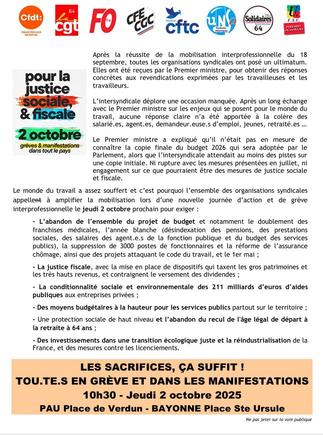Pyrénées-Atlantiques 2 octobre: Toutes et tous en grève et dans les manifestations ! TOUTES ET TOUS EN GREVE ET DANS LES MANIFESTATIONS LE 2 OCTOBRE PROCHAIN.Continuons la lutte !Appel intersyndical départemental. Partager: Navigation de l’article Précédent Article précédent Dès le 24 septembre: Toray – Appel à la grève et rassemblementSuivant Article suivant : 2 octobre: Pour la justice sociale & fiscale Autres actualités 22 décembre: Mobilisons-nous contre la loi immigration 2 mai : Les enseignements de la grève générale de Mai-juin 1968 28 avril : Journée mondiale de la sécurité et santé au travail : poursuivons et intensifions la lutte contre la réforme des retraites