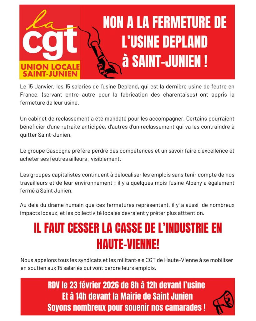 Haute-Vienne 23 février : Non à la fermeture de l’usine Depland à St Junien ! Partager: Navigation de l’article Précédent Article précédent Les vendredis de la colère : La Chênaie en colère !Suivant Article suivant : 24 février : Exigeons la réouverture de la ligne Morcenx-Bagnère de Bigorre Autres actualités 31 mars : Action des retraité.e.s – Rassemblement préfecture de Limoges Appel du Congrès – Motion de soutien Communiqué de presse : La CGT Legrand soutient ses camarades CGT ÉNERGIE ET CARSAT