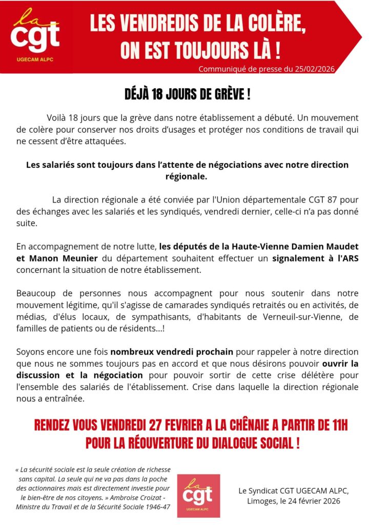 Haute-Vienne 27 février : déjà 18 jours de grève ! RV à la Chenaie pour la réouverture du dialogue social Partager: Navigation de l’article Précédent Article précédent Communiqué de presse : Depland St Junien : l’argent public pour les actionnaires, le minimum légal pour les salarié.e.sSuivant Article suivant : 28 février : Conférence de presse – Biosyl nous balade Autres actualités Les salariés de l’établissement Saica Pack St Junien en grève 1er mai : Rassemblement Limoges Communiqué de presse : 25 novembre journée internationale de lutte contre les violences faites aux femmes