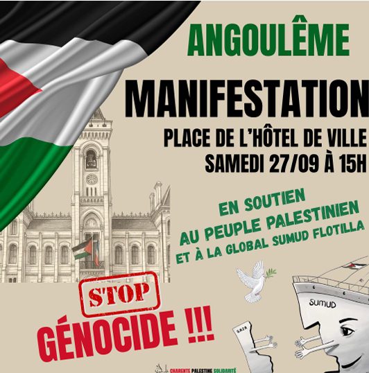 Charente 27 septembre : Manifestation en soutien au peuple palestinien Partager: Navigation de l’article Précédent Article précédent 2 octobre : L’intersyndicale départementale appelle à une mobilisation massiveSuivant Article suivant : 6 octobre: Réunion/débat sur le projet Périclès Autres actualités Communiqué de presse suite au 2ème tour des législatives 28 novembre : contre le projet de loi de sécurité globale L’allocation de rentrée scolaire ne doit pas servir à un patron voyou !