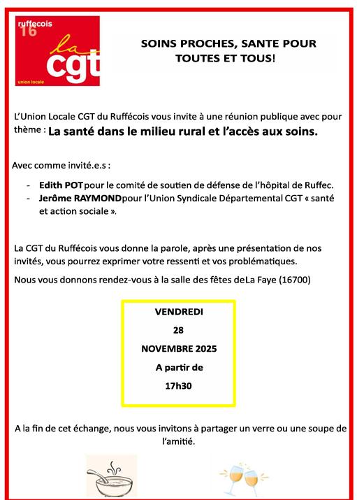 Charente 28 novembre: Réunion publique : La santé dans le milieu rural et l’accès aux soins Partager: Navigation de l’article Précédent Article précédent 2 décembre: En grève et en manifestation ! De l’argent il y en A !Suivant Article suivant : 2 décembre : De l’argent il y en A ! Autres actualités Communiqué de presse suite au 2ème tour des législatives 5 décembre : Journée d’action contre les licenciements, le chômage et la précarité 20 & 21 septembre : Journée internationale pour la Paix