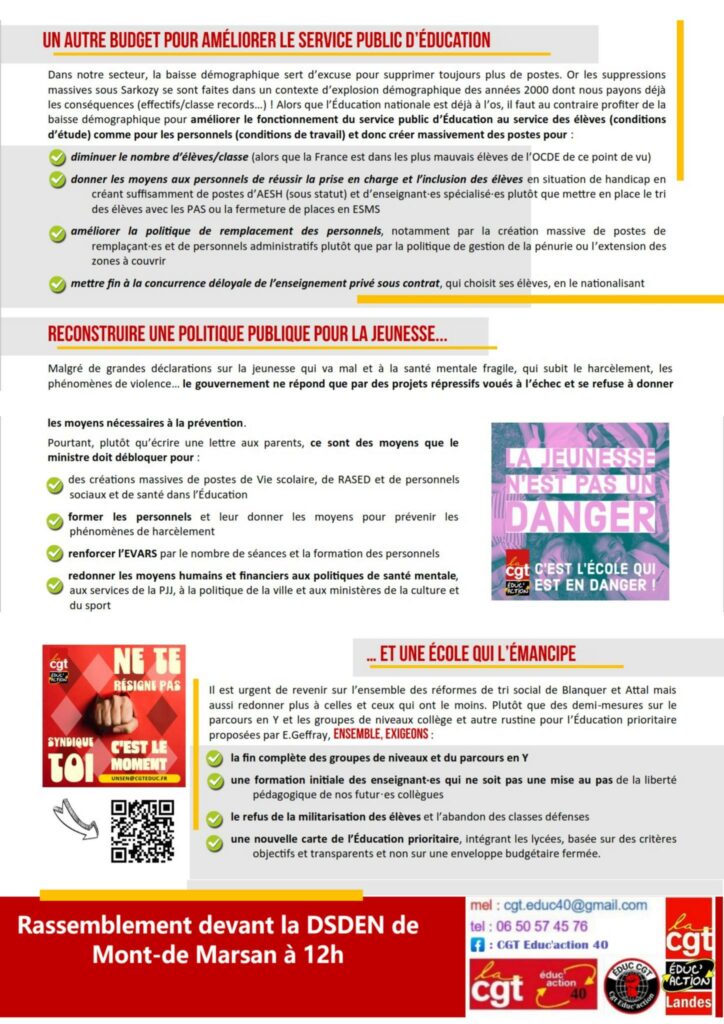Landes 31 mars : Mobilisation devant la DSDEN Partager: Navigation de l’article Précédent Article précédent Communiqué de presse : Le dimanche, c’est farniente en familleSuivant Article suivant : 31 mars : Dans l’éducation nationale, Moyens, salaires, conditions de travail, Amplifions la mobilisation Autres actualités 16 février : C’est toujours NON à la retraite à 64 ans Pétition : Stop à la suppression des emplois au centre hospitalier de Dax ! 10 septembre : Nous nous retrouvons pour notre liberté !