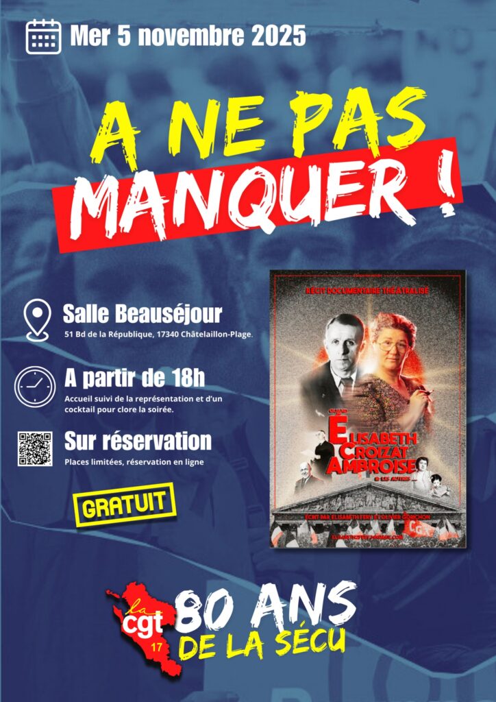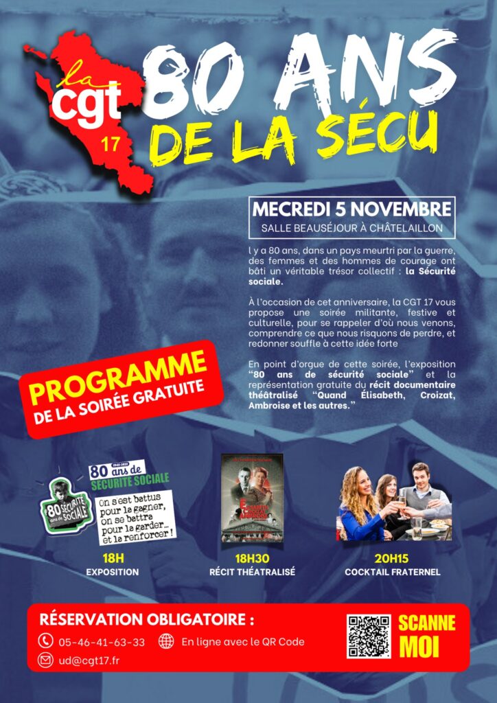 Réservation des billets obligatoire pour la soirée : https://my.weezevent.com/soiree-80-ans-secu-CGT17