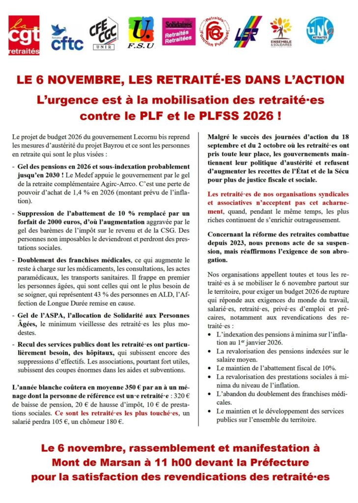 Landes 6 novembre : Les retraités ont toutes les raisons d’être en colère Partager: Navigation de l’article Précédent Article précédent 6 novembre : Les retraités ont toutes les raisons d’être en colèreSuivant Article suivant : 6 novembre : Manifestation des retraités contre l’austérité Autres actualités 7 mars : Contre la réforme des retraites : Grève et manifestation 13 avril : 64 ans, c’est NON ! 4 juin : Non à la fermeture du guichet SNCF de la gare de Morcenx !