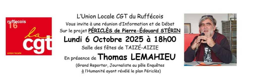 Charente 6 octobre: Réunion/débat sur le projet Périclès Partager: Navigation de l’article Précédent Article précédent 27 septembre : Manifestation en soutien au peuple palestinienSuivant Article suivant : 2 octobre: Grèves et manifestations pour la justice sociale, fiscale & environnementale Autres actualités 16 mars: Ligne Angoulême Limoges – OUI à la réouverture 27 janvier : Réunion publique de l’intersyndicale sur la réforme des retraites 5 décembre : Journée d’action contre les licenciements, le chômage et la précarité