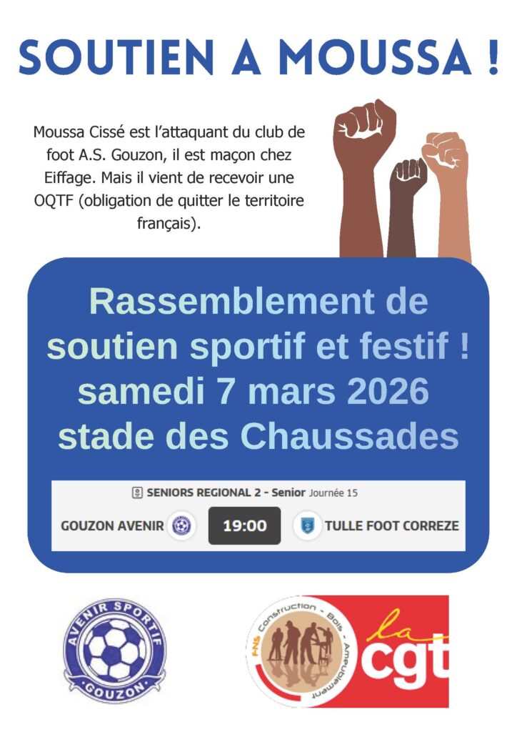 Creuse 7 mars : Soutien à Moussa ! Soutien à Moussa (le jeune salarié d’Eiffage menacé d’expulsion), au bord du terrain le samedi 7 à 19h, pendant son prochain match à Gouzon. Venez nombreux ! Partager: Navigation de l’article Précédent Article précédent 6 mars : Journée internationale de lutte pour les droits des femmes Autres actualités 13 octobre : Ne jouez pas à l’euromillions, Rendez vous à la manif Non à la réforme des Retraites 4 avril : Mobilisation du social et du médico-social