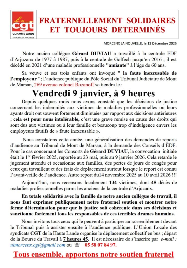 Nous invitons tous ceux qui le peuvent à participer au rassemblement devant le Tribunal puis à assister ensuite à l’audience publique. L’Union Locale des syndicats CGT de la Haute Lande organise le déplacement collectif en bus ; départ de la Bourse du Travail à 7 heures 45. Il est nécessaire de s’inscrire par e-mail : ulmorcenx.cgt@gmail.com ou 05 58 07 84 97.
