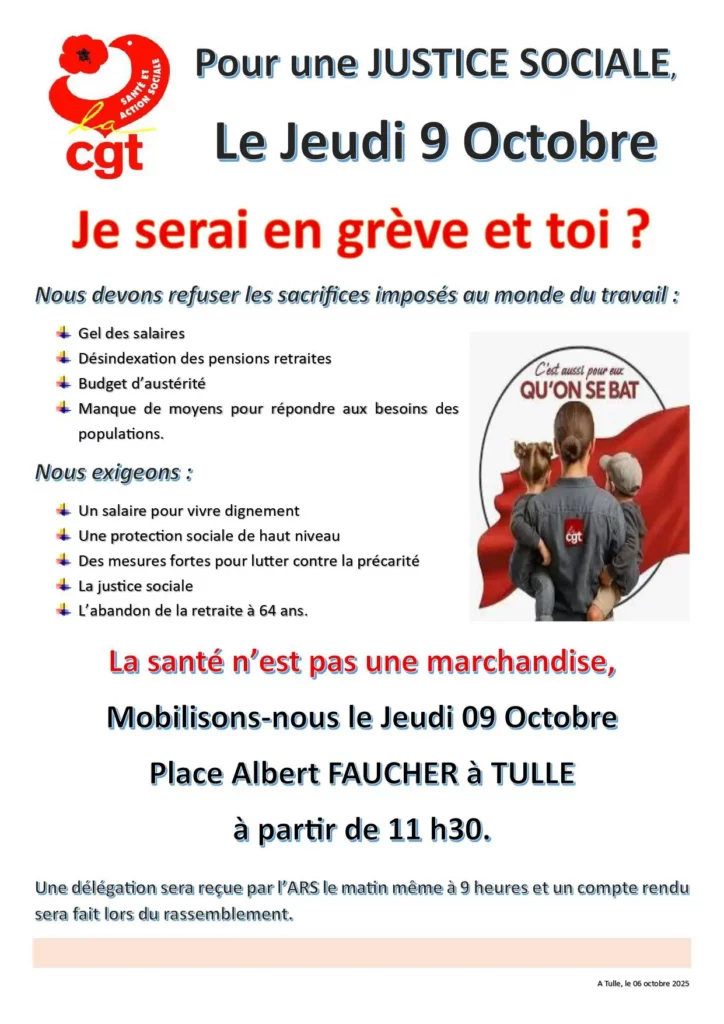Corrèze 9 octobre : Pour une justice sociale ! Partager: Navigation de l’article Précédent Article précédent 5 novembre: 80 ans de la Sécurité Sociale – Soirée militante, festive et culturelleSuivant Article suivant : 10 octobre : Réunion publique : Ensemble défendons et construisons une protection sociale solidaire Autres actualités 6 avril : Israël / Gaza : Stop aux massacres ! 16 décembre : Dénonçons l’attitude de la préfecture dans le traitement des dossiers de titres de séjour 21 novembre : Pour la défense de nos libertés