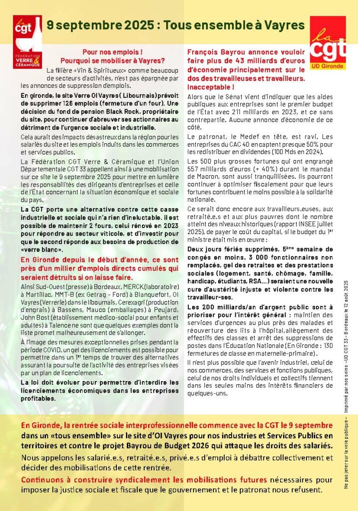 Gironde 9 septembre : Tous ensemble à Vayres !! Partager: Navigation de l’article Précédent Article précédent 9 & 10 septembre : Grève et mobilisationSuivant Article suivant : La VO : Le festival d’Uzeste, un compagnonnage singulier entre artistes et syndicalistes Autres actualités 8 septembre : Conférence avec Roland Gori et Film documentaire « Une époque sans esprit » Vayres : Philippe Martinez vient soutenir les salarié·e·s de la Verrerie 1er mai : Manifestation unitaire à Bordeaux