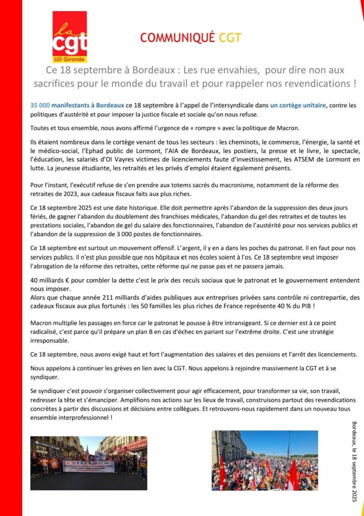 Gironde Communiqué : Ce 18 septembre à Bordeaux : Les rues envahies pour dire on aux sacrifices pour le monde du travail et pour rappeler nos revendications ! Partager: Navigation de l’article Précédent Article précédent 6 novembre : Forum – Salariés en situation de handicap, de quoi parle-t-on ?Suivant Article suivant : Communiqué : 21 septembre – Rassemblement pour la Paix Autres actualités LETTRE OUVERTE A LA PREFETE DE GIRONDE 26 avril : Rassemblement devant l’entreprise Fonmarty à Bazas 16 décembre: Rassemblement pour une paix juste et durable