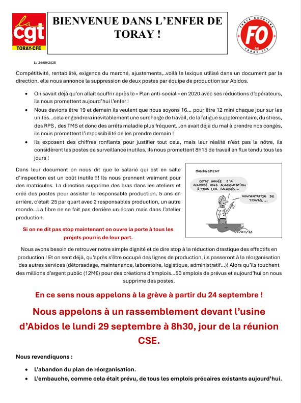 Pyrénées-Atlantiques Dès le 24 septembre: Toray – Appel à la grève et rassemblement TORAY – Appel à la grève dès le 24 septembre et à rassemblement devant l’usine d’Abidos le lundi 29 septembre dès 8h30 :Pour l’abandon du plan de réorganisation,Pour les emplois. Partager: Navigation de l’article Précédent Article précédent 2 octobre: On accélère !Suivant Article suivant : 2 octobre: Toutes et tous en grève et dans les manifestations ! Autres actualités 8 mars : Journée internationale des droits des femmes 19 décembre: Appel à soutien 25 novembre: Journée internationale de lutte contre les violences faites aux femmes